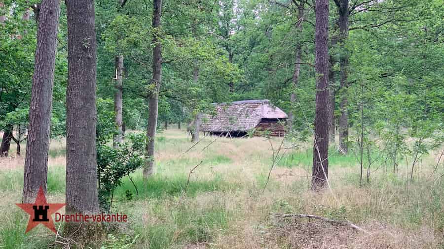 We lopen langs een typisch Drentse schaapskooi. Een inmiddels oud houten gebouwtje met een rieten dak. Verscholen in de bossen lijkt in "the middle of nowhere" te staan.